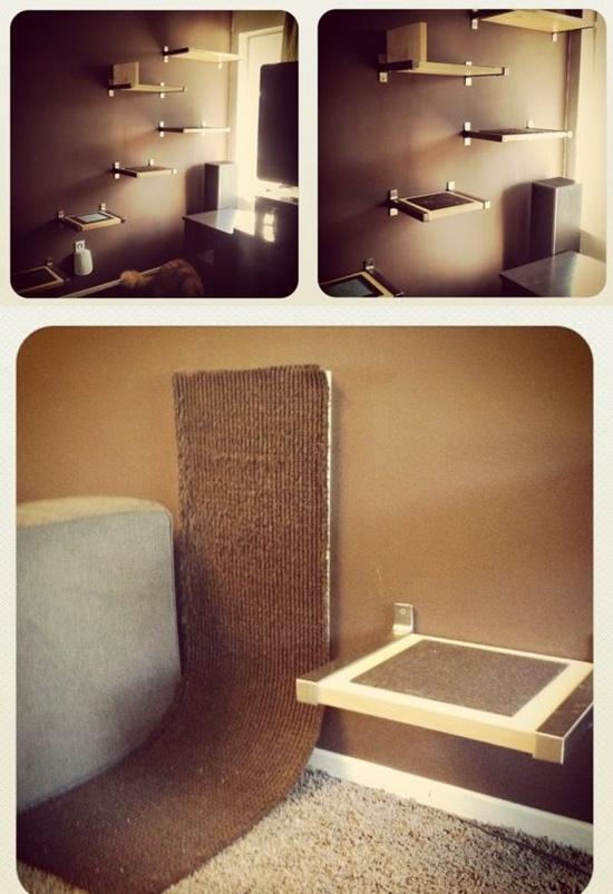Ý tưởng cuối cùng dành cho những ai nuôi mèo. Các nhóc mèo rất thích leo trèo khám phá, ngủ ở những nơi cao như trên nóc ti vi, giá sách do vậy hãy đóng những kệ gỗ nhỏ lên tường để cho lũ mèo của bạn tự chọn nơi ngủ yêu thích nhất.